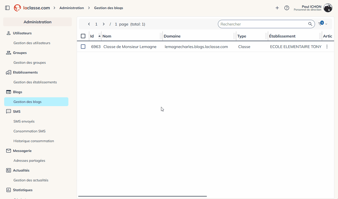 Dans l’onglet « gestion des blogs », vous retrouvez l’ensemble des blogs créés dans votre établissement. Certains peuvent être anciens ou en cours d’archivage. Vous pouvez archiver les blogs directement depuis cette interface.