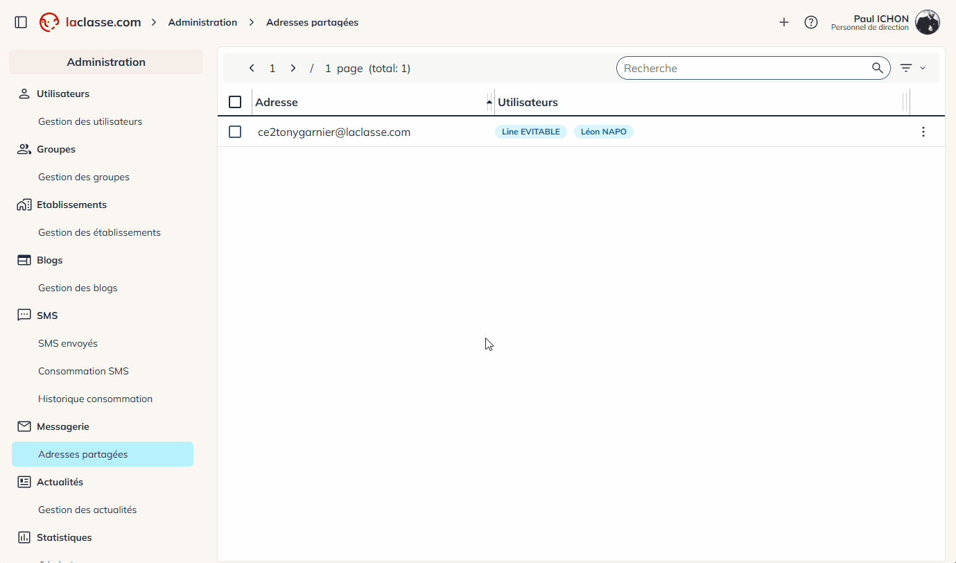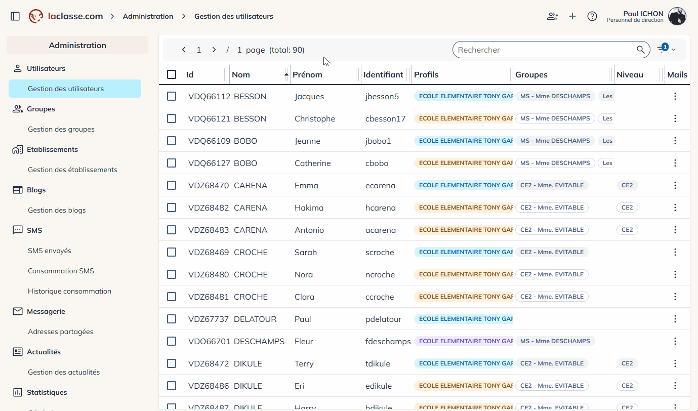 Dans le panneau d’administration et la gestion des utilisateurs, vous pourrez consulter tous les comptes utilisateurs de votre établissement.
