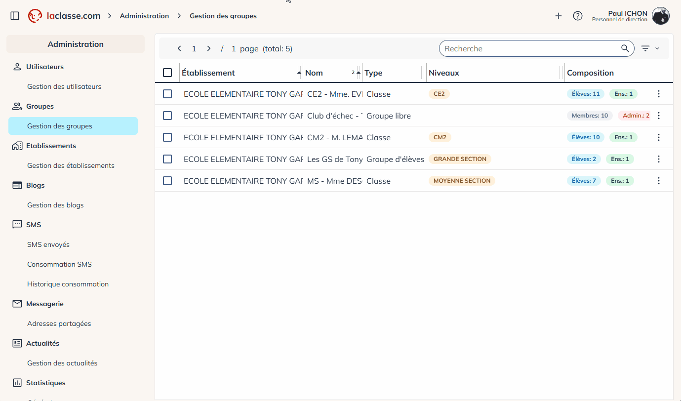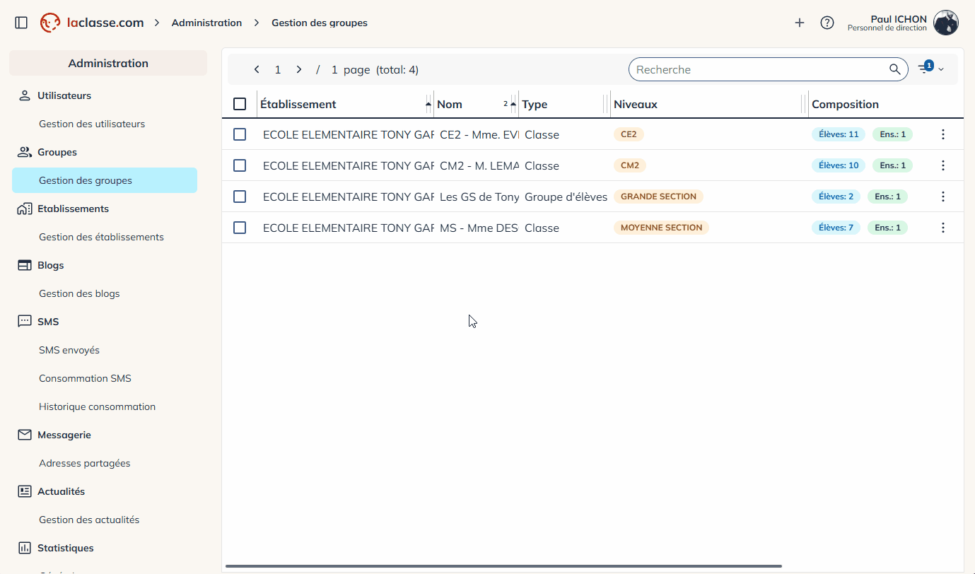 Dans le panneau d’administration et la gestion des groupes , vous pourrez consulter tous les comptes utilisateurs de votre établissement.