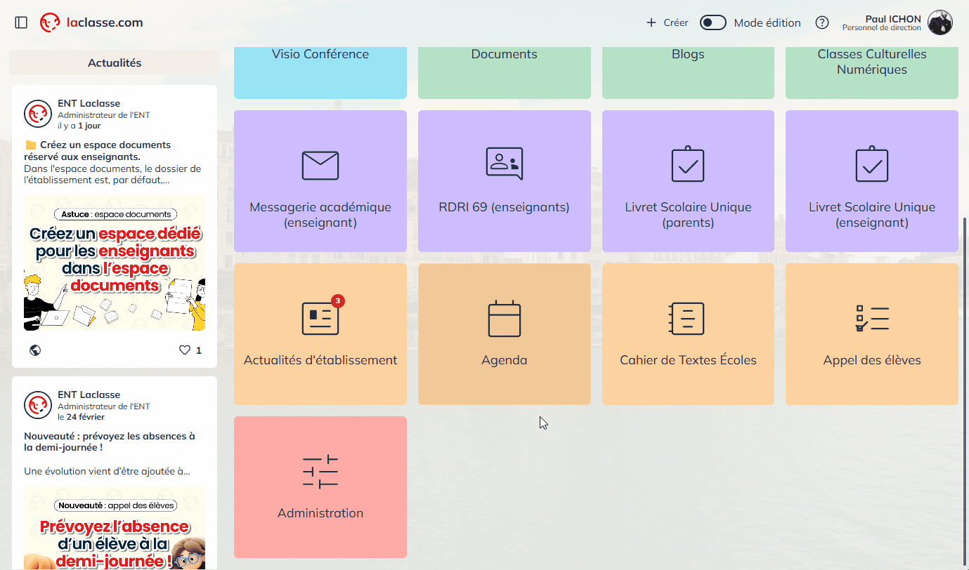 Les utilisateurs disposant du rôle d’administration peuvent intervenir comme un personnel de direction sur laclasse.com, notamment en modifiant des données et en attribuant des droits d’accès.