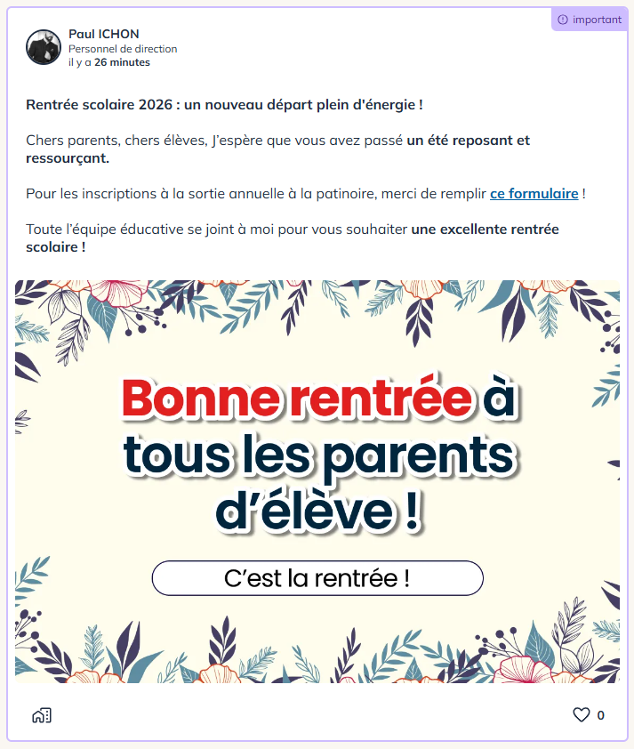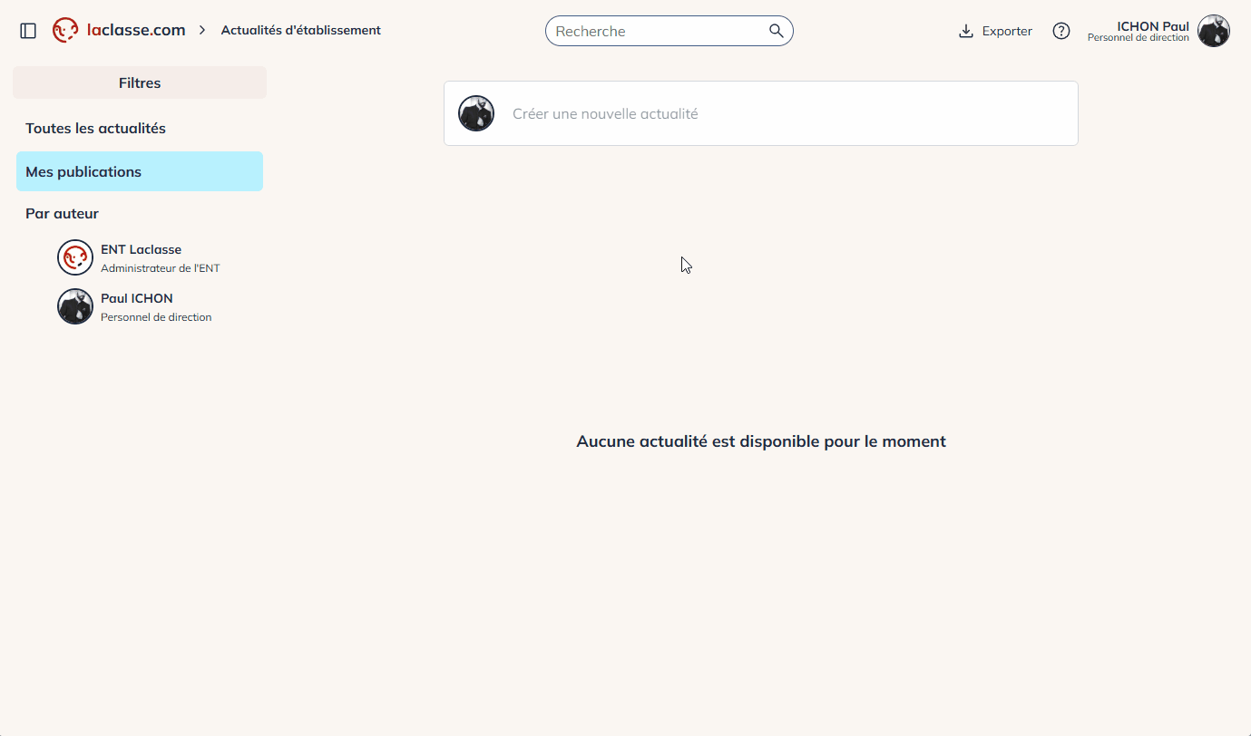 Dans cet exemple, je vais publier en tant que « Paul Ichon » le directeur, pour tous les membres de mon établissement (élèves, équipe éducative, parents).