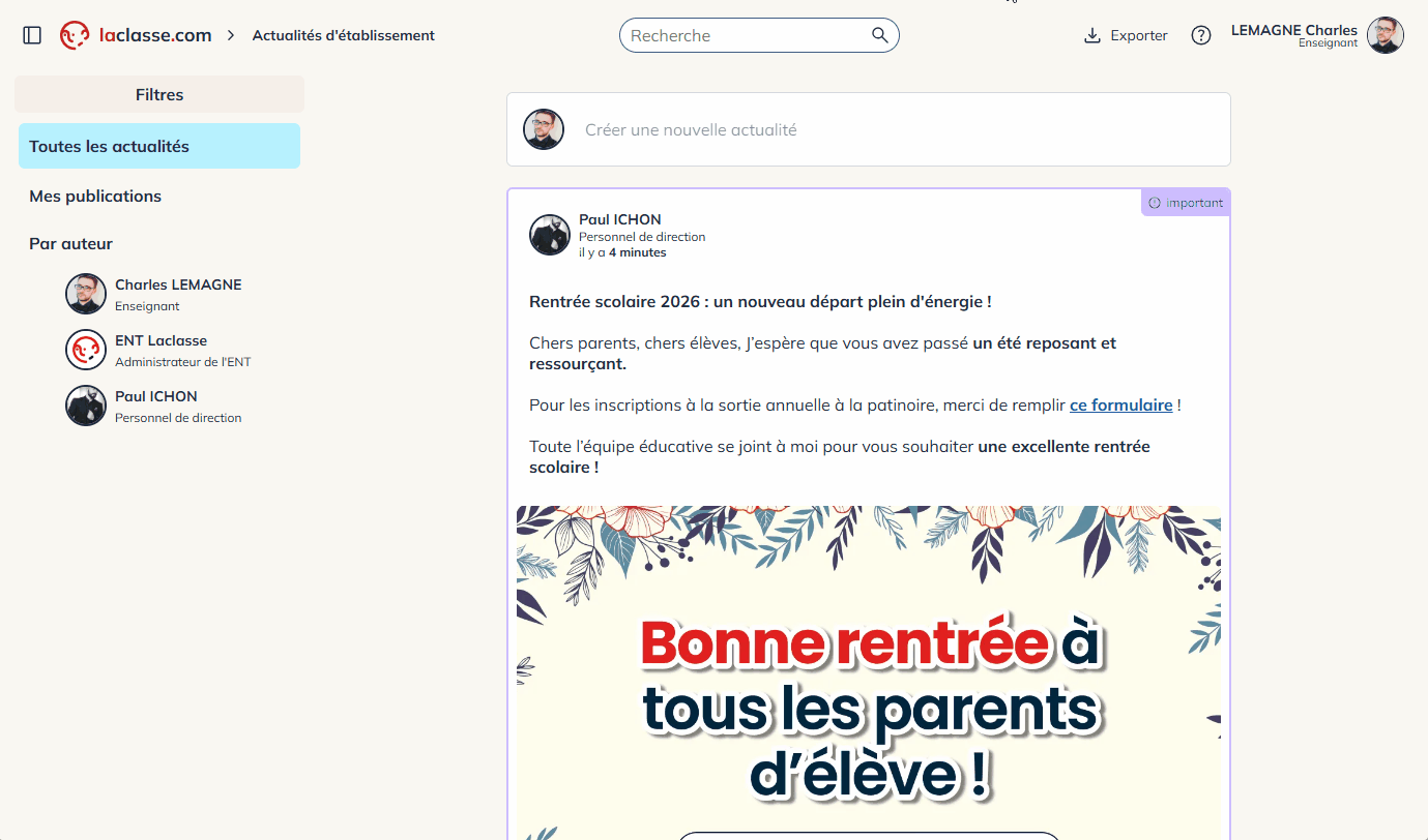 Dans cet exemple, je vais publier en tant que « Charles Lemagne » un enseignant, pour tous les responsables d’élèves de ma classe.