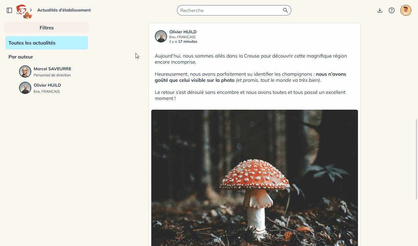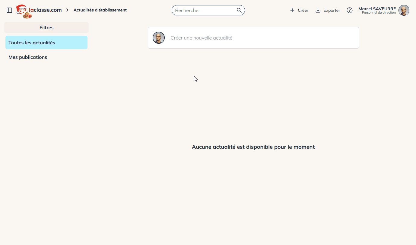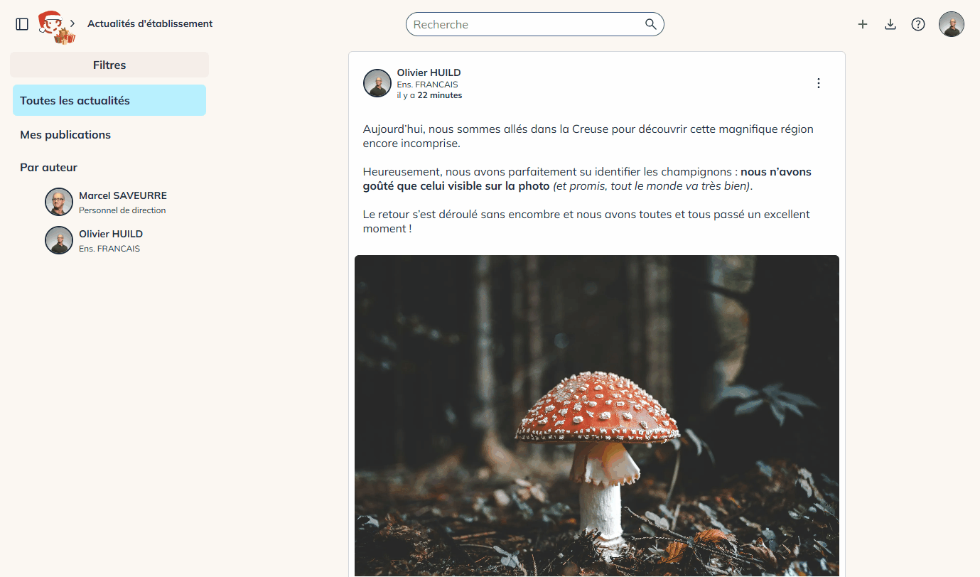 Cette fonctionnalité se présente sous forme d’un fil d’actualités. Les élèves et les responsables d’élèves peuvent consulter et réagir aux publications. Les membres de l’équipe éducative peuvent créer des publications pour les membres des groupes et classes de leur établissement.