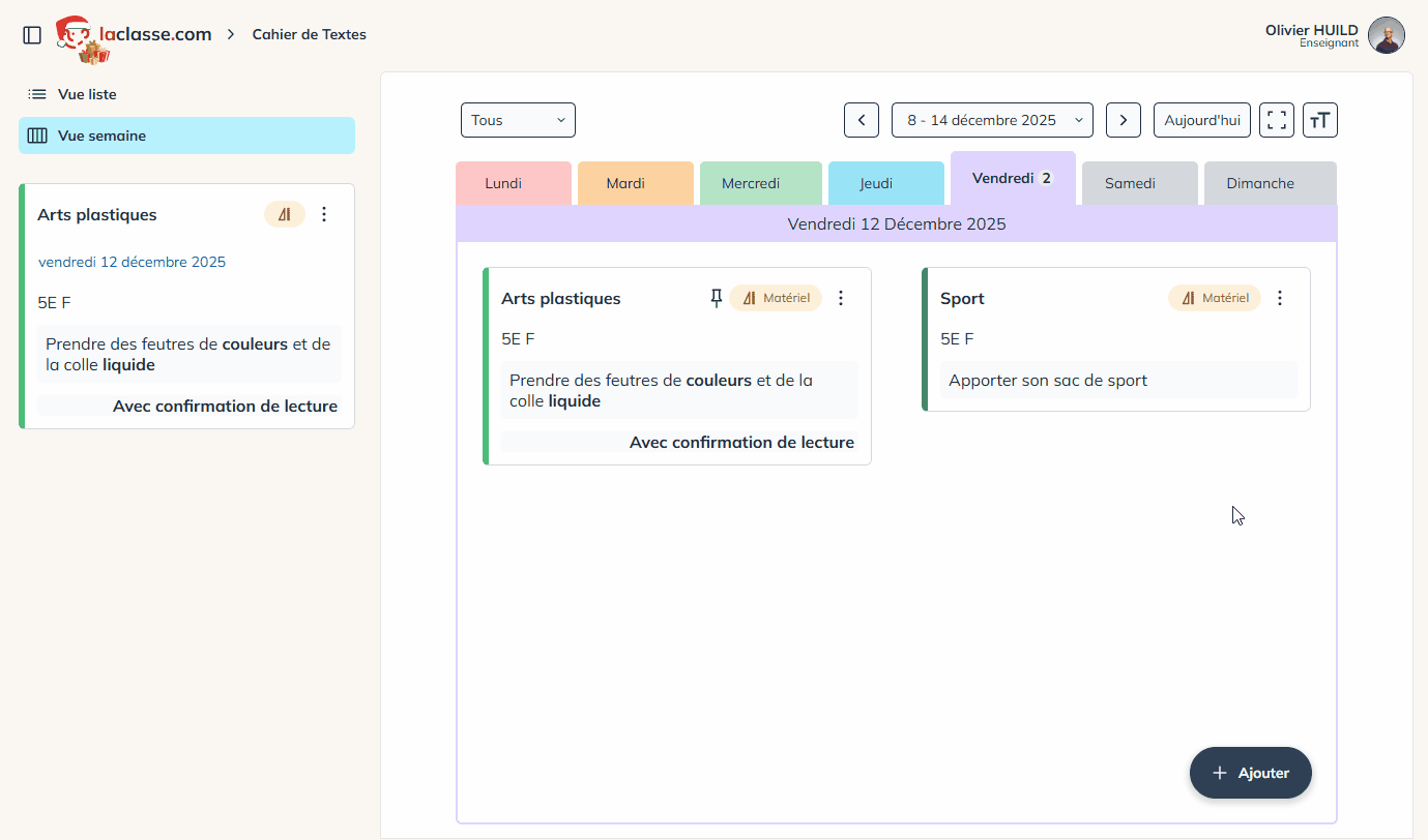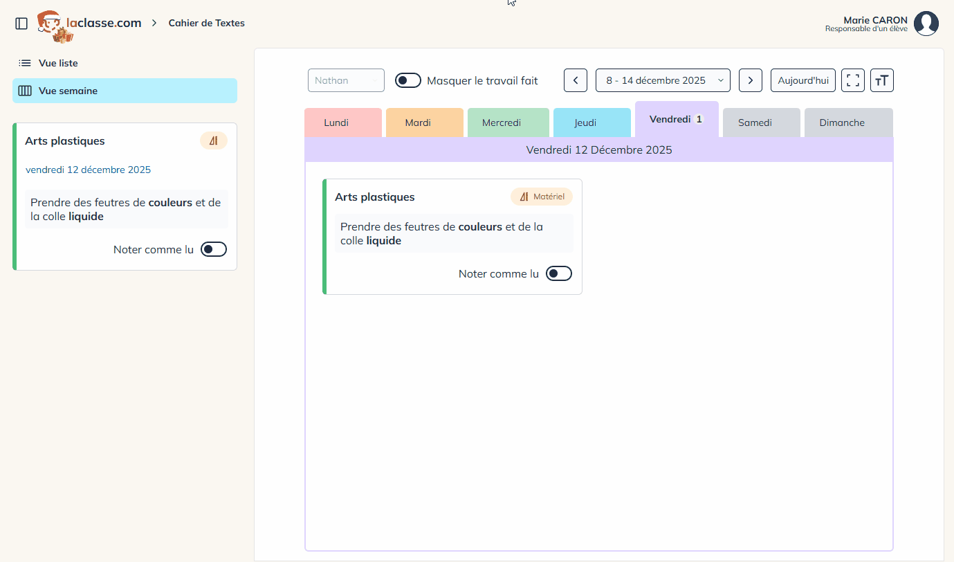 Chaque enseignant y retrouve ses classes, chaque parent visualise les devoirs de ses enfants.