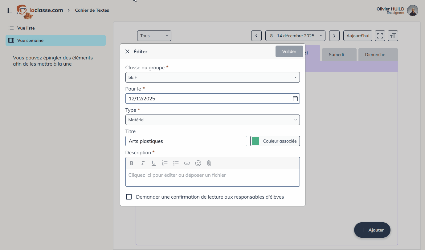 Lorsque vous créez un devoir ou une tâche, vous pouvez activer la confirmation de lecture. Cette option permet aux responsables d’élève (pas l’élève lui-même) de confirmer qu’ils ont bien pris connaissance du devoir.