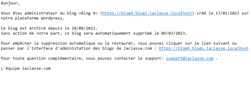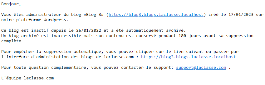 Sans action de l’administrateur du blog dans les 6 mois, un 3ème mail est envoyé pour notifier de la suppression définitive du blog :